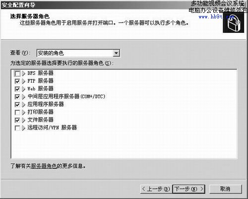 Windows 2003服務(wù)器提供了數(shù)量眾多的服務(wù)器角色,如文件服務(wù)器、DHCP服務(wù)器等,但并不是所有的角色都是需要的。使用不慎,反而會增加服務(wù)器的安全隱患。利用SCW的“選擇服務(wù)器角色”向?qū)Ь湍茌p松完成角色的選擇。