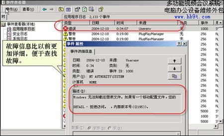 在進(jìn)行上述修改前,事件查看器具有較低的查看級別,一些事件不會被記錄下來。修改后,可以更詳細(xì)地了解系統(tǒng)狀況。當(dāng)Windows 2000關(guān)機(jī)速度緩慢時,只要進(jìn)入“開始→控制面板→管理工具→事件查看器”,點(diǎn)一下“應(yīng)用程序日志”,這時就會看到詳細(xì)的故障信息,(如圖2)。