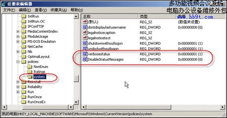 第一步:打開注冊表編輯器,找到[HKEY_LOCAL_MACHINESOFTWAREMicrosoftWindowsCurrentVersionpoliciessystem],在里面建立一個名為“verbosestatus”的DWORD值,然后將它值設(shè)為1。