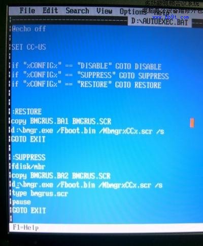 兩個文件創(chuàng)建完畢后,不要退出DOS,用edit編輯器打開D盤下的Autoexec.bat文件,大家注意了,此Autoexec.bat非我們剛才創(chuàng)建Autoexec.bat,它是由d2dfdzip.exe解壓縮而來的,它的用途就是在運(yùn)行時自動執(zhí)行其中的指令,將相應(yīng)的代碼寫到硬盤的引導(dǎo)扇區(qū)中,這樣就將F11鍵和恢復(fù)系統(tǒng)關(guān)聯(lián)起來了。在沒有軟驅(qū)引導(dǎo)的情況下這個文件也不可能自動運(yùn)行了。因此就得靠人為輸入來執(zhí)行,但是原來這個文件是按照在軟驅(qū)中運(yùn)行而編寫的,所以在路徑上稍作修改就行了。