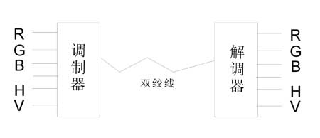 但是,有時(shí)候需要將VGA信號(hào)傳輸?shù)酱笥?0米的地方,則必須進(jìn)行信號(hào)變換,將VGA調(diào)制到一個(gè)固定的頻率上發(fā)送出去,接收端收到信號(hào)后再解調(diào)出來(lái),從中分離出紅、綠、藍(lán)三基色以及行、場(chǎng)同步信號(hào),再傳輸給顯示器。具體流程如下圖: